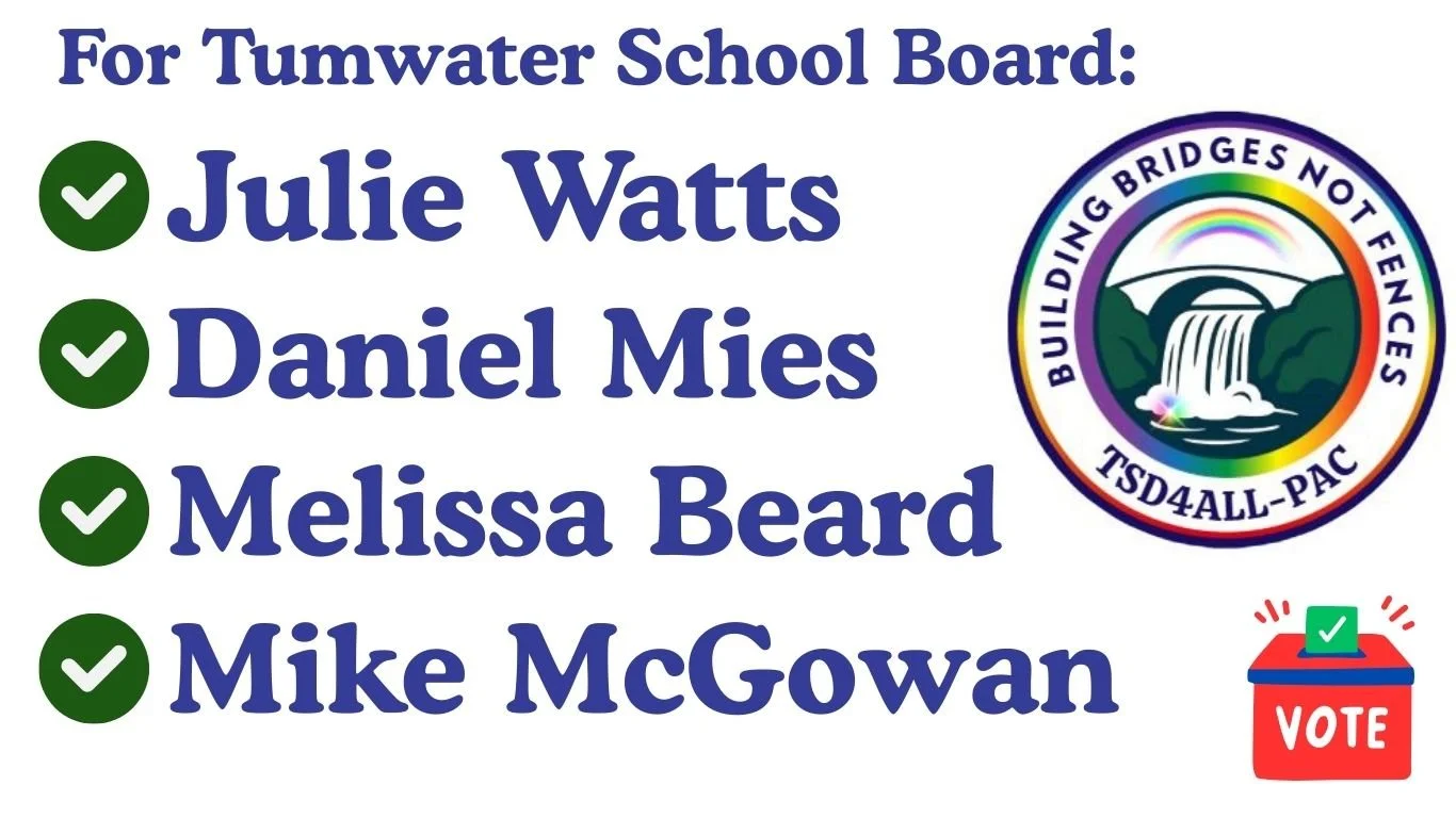 In this election, vote for a slate of inclusive School Board candidates and show that in Tumwater, ALL students belong.